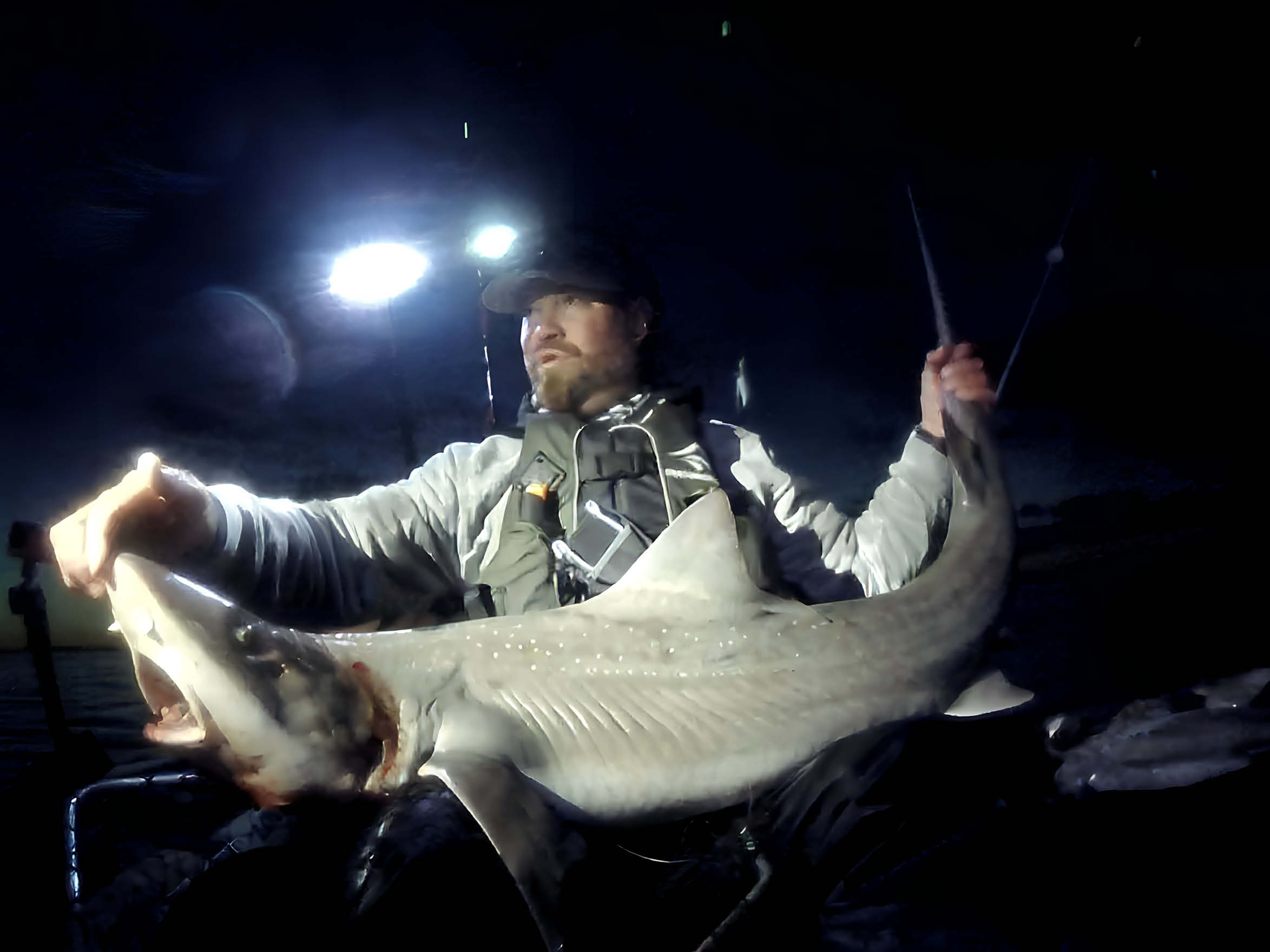 I brought it back up to the side of the kayak and managed to grab hold of my net’s handle, attempting to pull this muscle-bound beast across my legs. It was like trying to hug a freight train! No sooner had I done that than it wriggled free and splashed back into the water. My reel started screaming again as the fight was far from over.